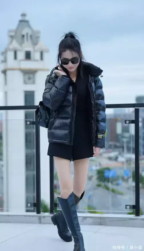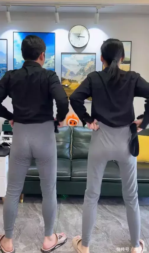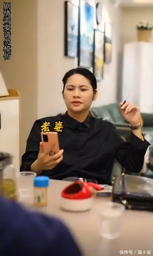 视频中,她学着老公的样子,身穿黑色的衬衫,银灰色的西装裤,脚踏时尚的小皮鞋,别上一条腰带,嘴上叼根烟,胳膊夹着公文包。