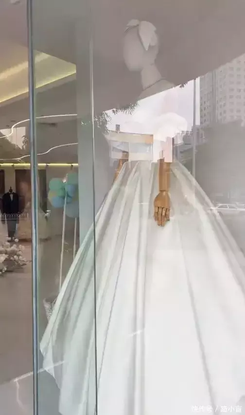 当时的她身着一身红色的新娘服,脚上踩着高跟鞋,走起路来很不方便,推车的样子也是狼狈极了。