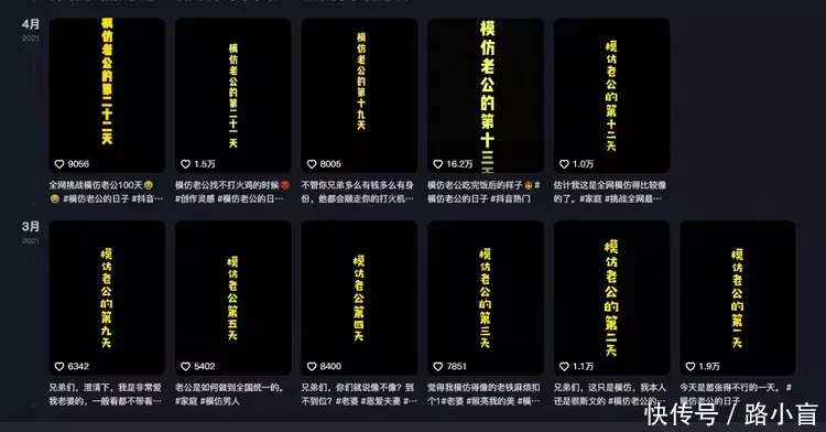 她的视频标题也是简洁明了“模仿老公的第一天”、“模仿老公的第二天”、“模仿老公的第三天”......